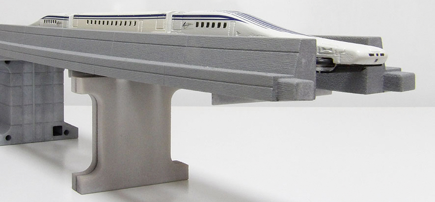 車両の浮上を実感する、底部が解放された高架型軌道。鉄道模型レイ アウトやジオラマに立体交差として組み込めます。